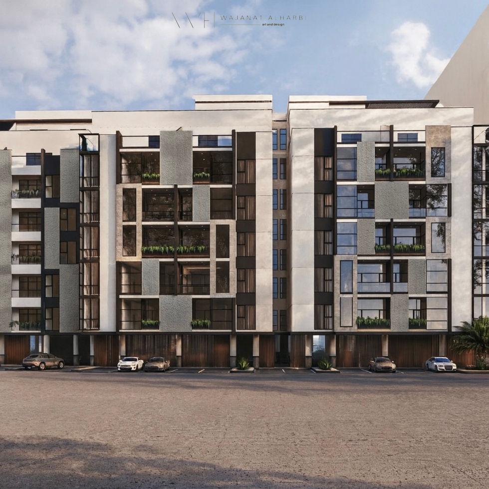 A modern residential complex façade design featuring a refined blend of materials, creating a distinct and standout architectural identity.